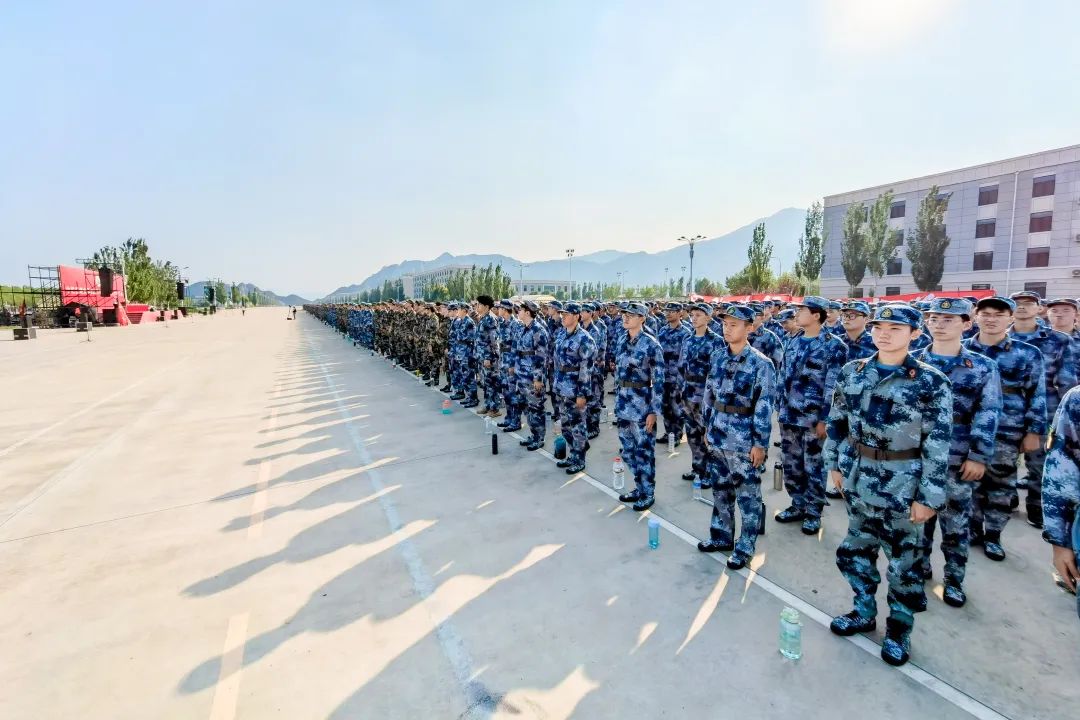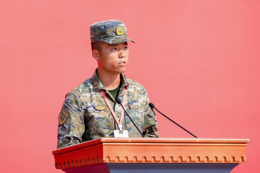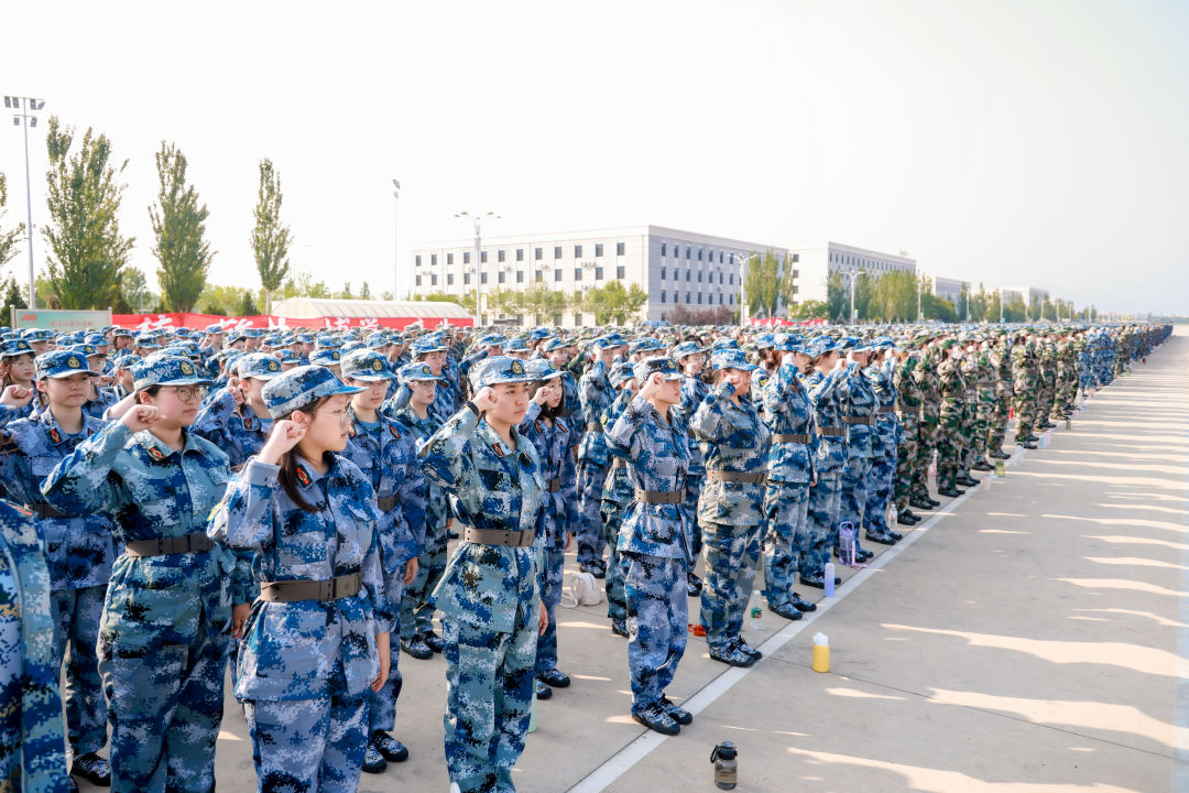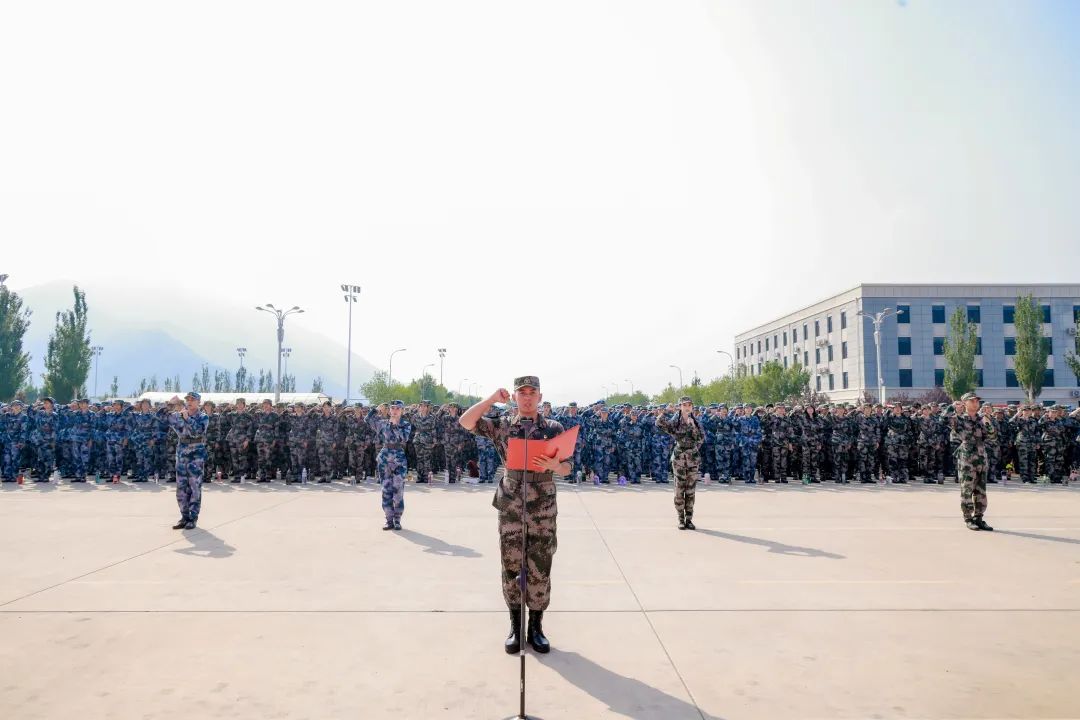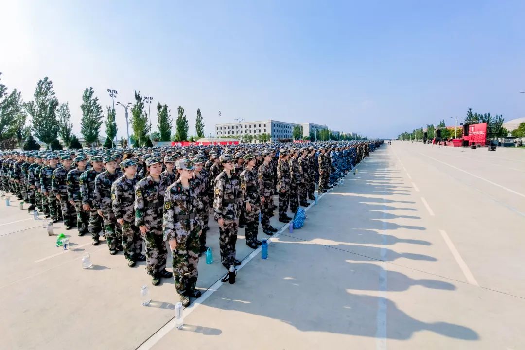 全体参训学生在白杨先锋队的带领下庄严宣誓:服从命令,听从指挥,恪守纪律,尊重教官,磨练意志,顽强训练,立德敬业,博学竞先,奋斗有我,建功中传,矢志报国,使命在肩。