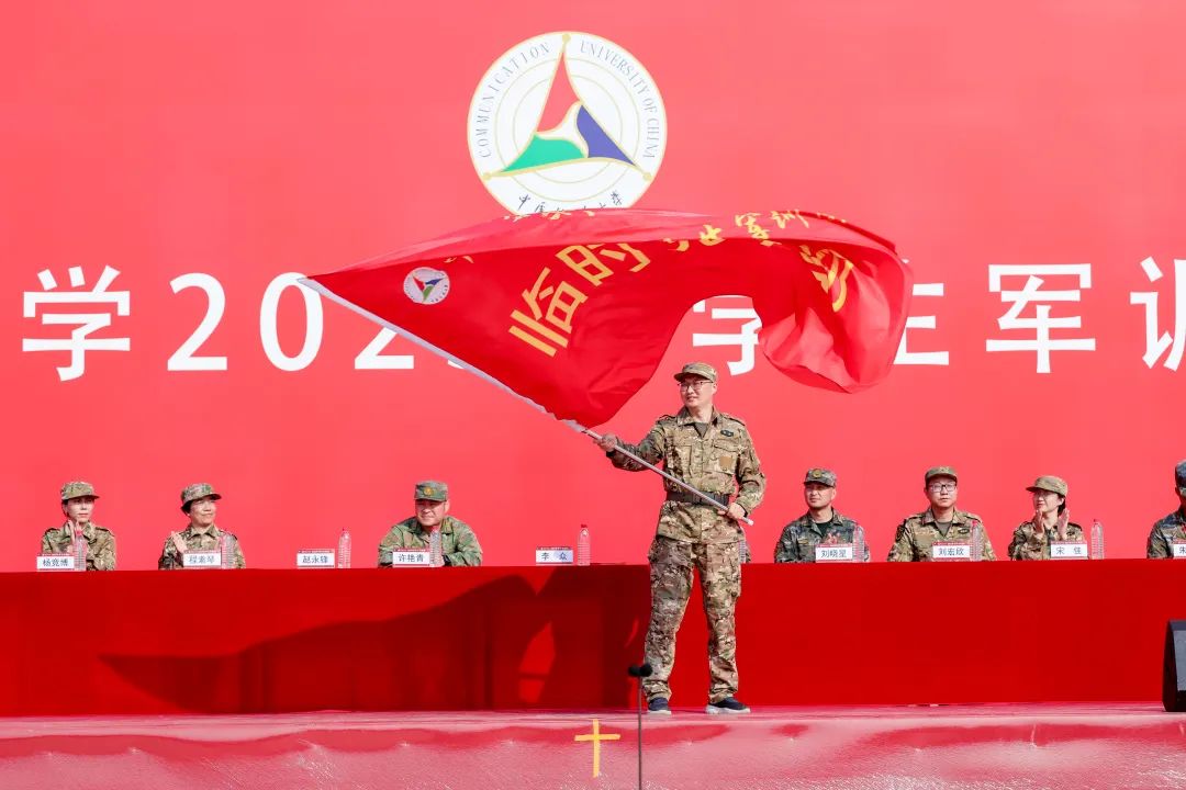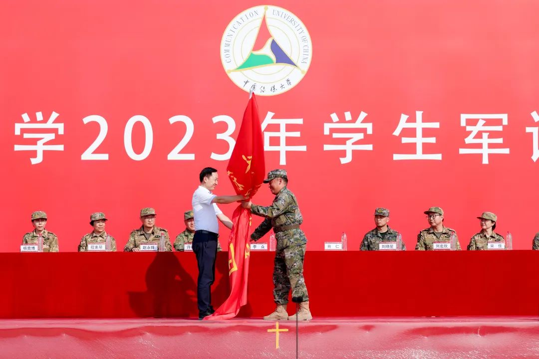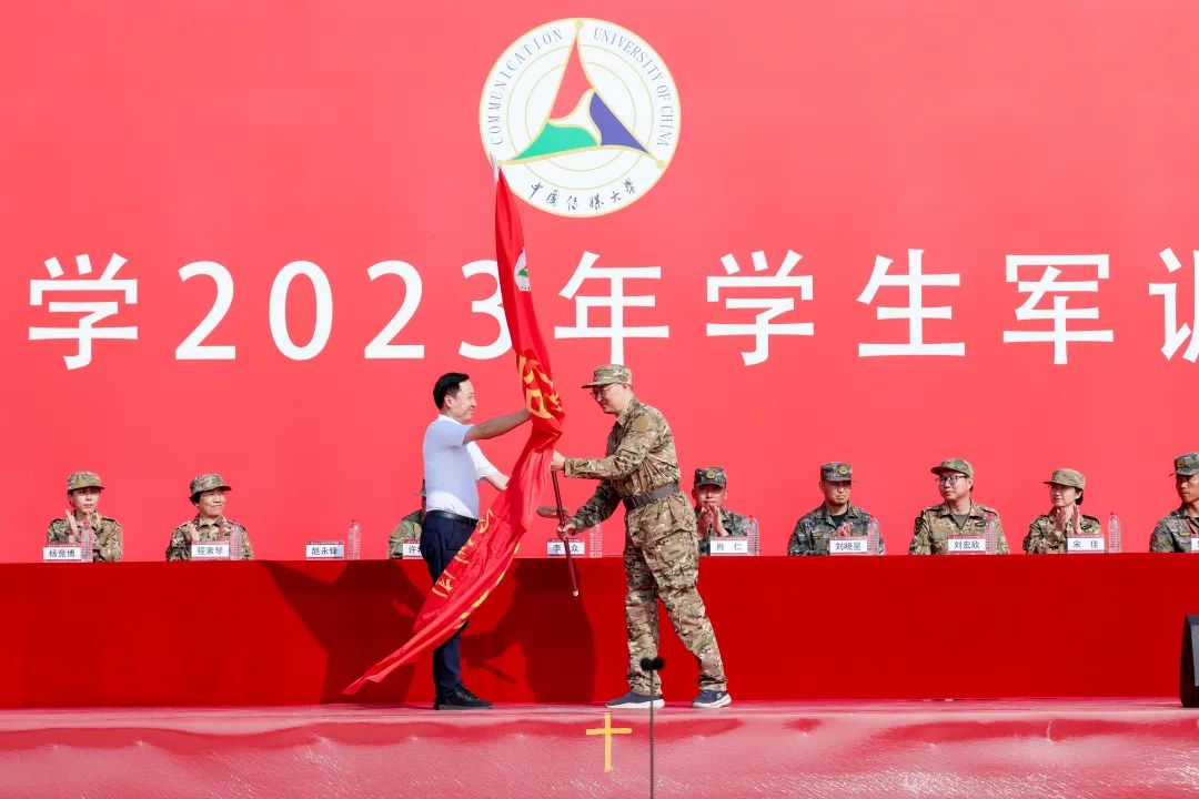李众向军训团授予团旗,肖仁接旗;向中国传媒大学学生军训团临时党支部授旗,赵永锋接旗。